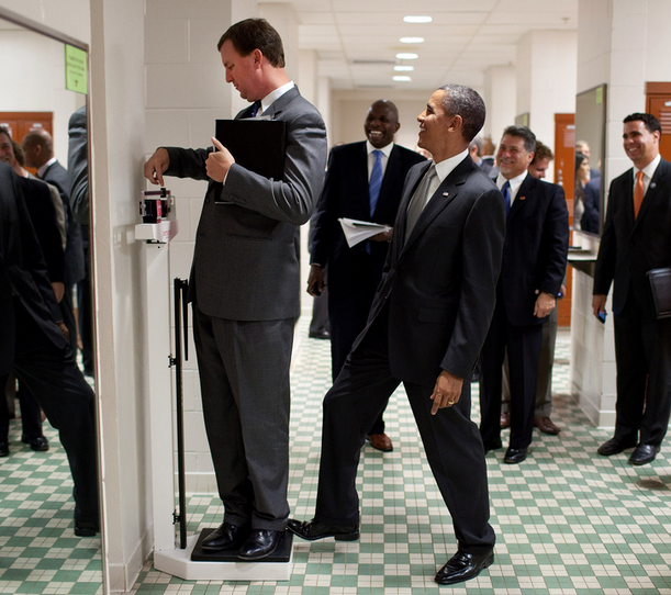 Despite describing the image accurately, it misses the main point: “President Barack Obama was playing a prank, making the other man weight more by stepping on the weight scale.”